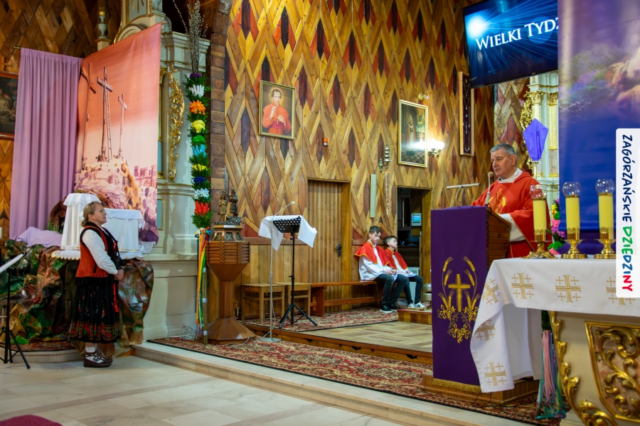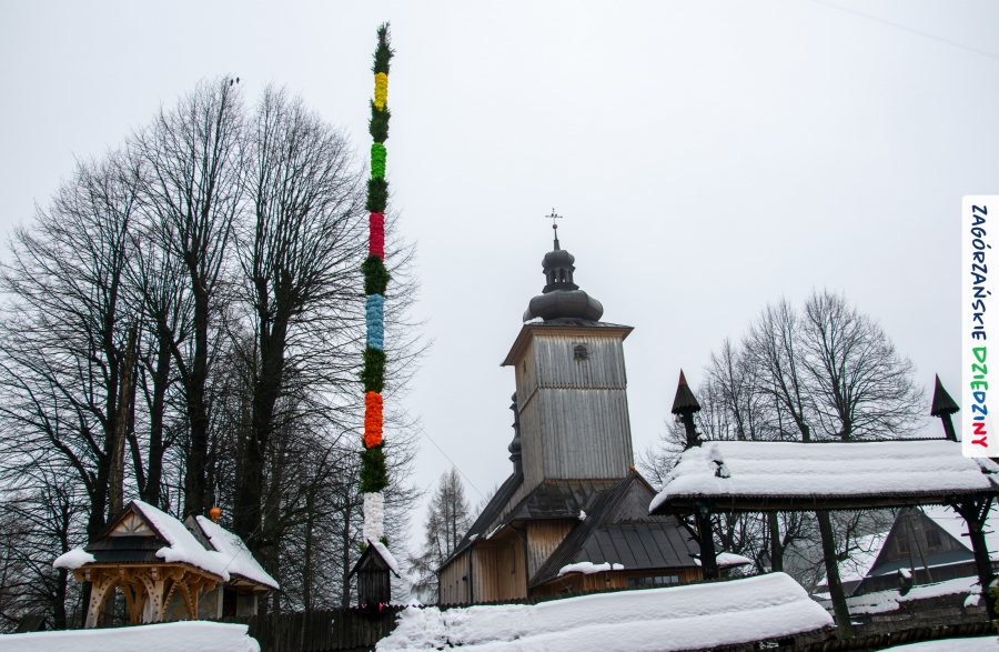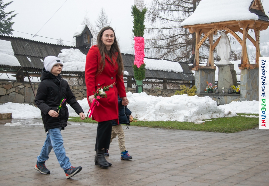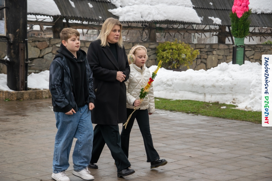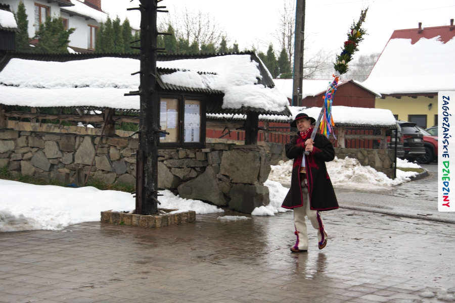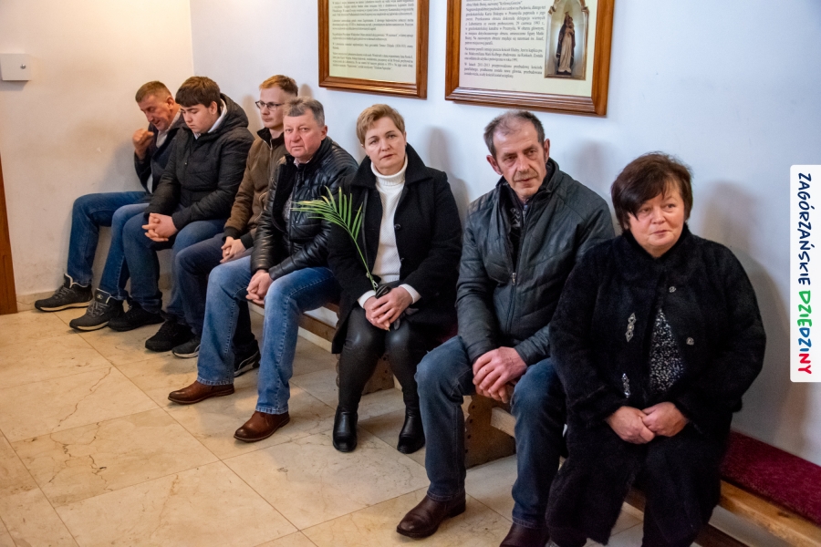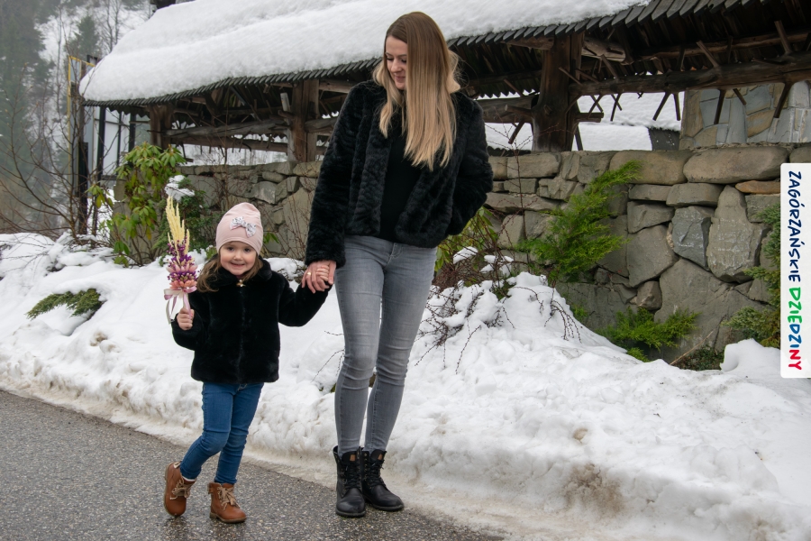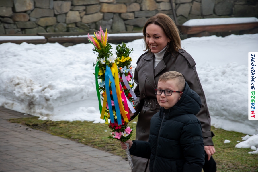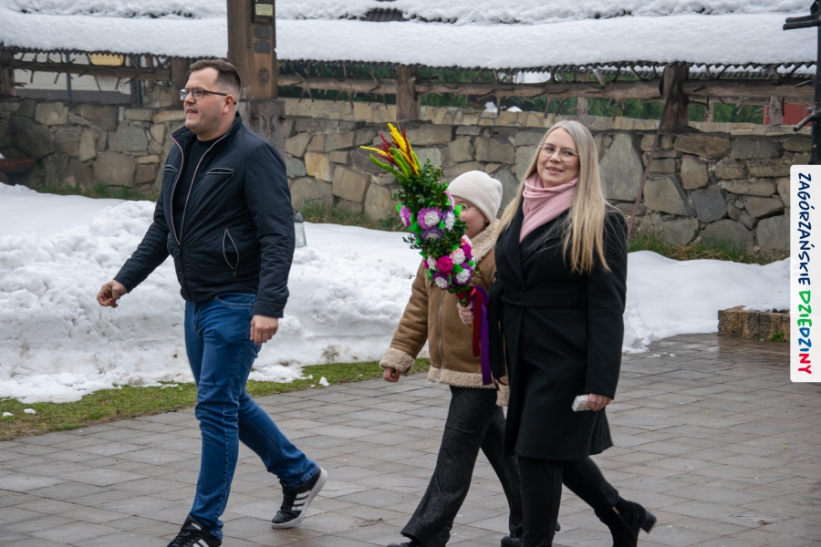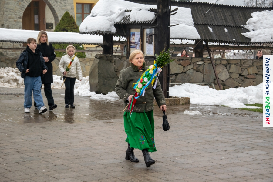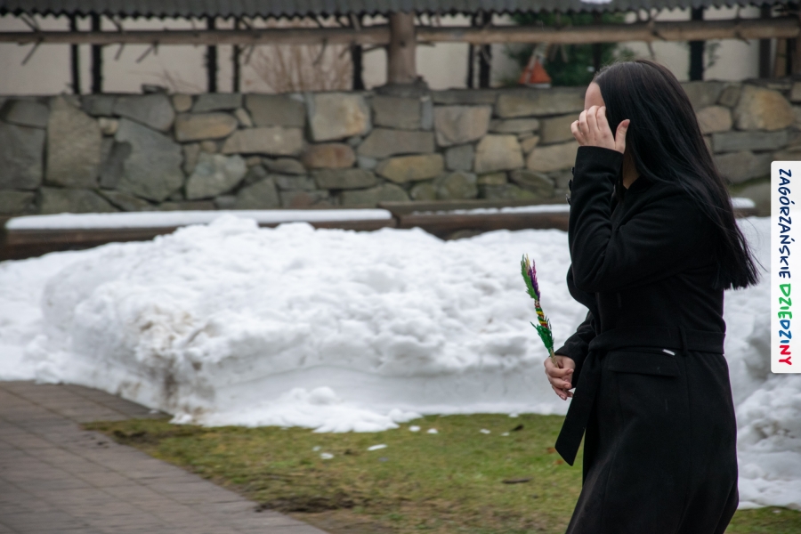 Nim jednak tam się udamy z przyjemnością opowiemy jak wyglądała „ta ostatnia niedziela” w Lubomierzu. Było… kolorowo, jakby na przekór bieli ścielącej się wokół nas oraz gęstej mgle, która w ten weekend upodobała sobie szczególnie tę gorczańsko – beskidzką miejscowość. Wierni kroczyli dumnie do kościoła dzierżąc w dłoniach palmy, w przeważającej większości własnoręcznie zrobione. Nieraz mama musiała pomóc małym i słabym jeszcze rączkom, bo ciężar zielonego bukszpanu i bibułkowych kwiatów skutecznie przechylał palemki to w jedną, to w drugą stronę… Nikt nie rywalizował o – nomen omen – palmę pierwszeństwa, chociaż oglądając niektóre okazy żartowaliśmy, że jednak powinniśmy byli zorganizować konkurs… Niespodziankę zrobił nam mający głowę nie tylko od parady i na trzymanie na niej kapelusza – Grzegorz. Jak zwykle, cichutko, siedział na Słomce i dumał… Wydumał, wystroił siebie i swoją palmę w dziedzinne akcenty i z szelmowskim uśmiechem wkroczył w bramę świątyni, jak na czerwony dywan! Wiedział, że nam się to spodoba! Z ogromną radością witaliśmy mniej lub bardziej znajomych, ze stałymi bywalcami naszych wydarzeń witaliśmy się jak z rodziną. Moc z nieba dopisała nam nie tylko w postaci „przypadkowego” przybysza. Jak Anioł spadł nam w ten dzień Konrad (ujęły nas trzy jego „łobuzy”), którego „z tłumu wyrwał” – to cytat z O. Proboszcza, Marka Kustronia – celebrans do czytania Ewangelii o Męce Pańskiej, którą zwyczajowo dzieli się na role. W zadumę Wielkiego Tygodnia wprowadziła nas rodzinna kapela Kościelnioków z Olszówki, a ułożone przez nich głębokie rozważania zawarte w wezwaniach modlitwy wiernych  poruszyły w naszych sercach wrażliwą strunę. Nic tu nie dzieje się przypadkiem. Pan Bóg tak łączy z nami ludzi i kieruje naszymi decyzjami, że wszystko układa się w jedną całość. Swoje miejsce w tej układance ma Pan Stasiu skrywający pod sumiastym wąsem dobrotliwy uśmiech, który zdradzają zawsze jego serdeczne oczy, Pan Tomek, który wyszedł chyba z założenia, że rzadki gość to dobry gość (i wiecie co? autentycznie ucieszyliśmy się na jego widok!), Pan Franek, zawsze życzliwy, wystrojony i wynajdujący mnóstwo okazji do poczęstowania cukierkiem (tym razem to były jego imieniny – dużo zdrowia drogi Solenizancie!), czy Pani Irenka, nie robiąca wokół siebie zamieszania, ale zawsze z ochotą uczestnicząca w naszych wydarzeniach… Nie sposób nie wymienić tutaj drugiego Stanisława, tak, tak, tego, po którym humor odziedziczył nasz cudny Paweł… Jak w tej wyliczance pominąć naszych dziedzinnych producentów lokalnych, czekających na każde kolejne spotkanie: Ani i Józefa Bierowców, których miody słynne są nie tylko w Polsce, ale i w Monachium na przykład czy na kardynalskich lub ministerialnych stołach; Zosi Pietoń, którą mąż wozi jak królową aby czarowała nas misternymi koronkami czy Monikę Kołodziej, która na swoim słodkim stole ma nie tylko babeczki (jak nieco przekornie sugeruje nazwa jej cukierni)… Cichym bohaterem tych naszych niedzielnych spotkań w Lubomierzu jest tamtejszy sołtys, Józef Nieckula i jego syn, Marcin (jego chcieliśmy „wynająć” również do Kasiny ;-)) dbający o to, aby biały namiot czekał w gotowości nie tylko na wystawców, ale i amatorów dziedzinnego dobra. Na deser zostawiliśmy sobie informację o Wojciechu, który z perspektywy Krakowa zawsze łączy się z nami przez Internet… W tym szczególnym dniu towarzyszył nam jeszcze ktoś wyjątkowy, kogo już 30 lat nie ma pośród Zagórzan, a którego po Mszy św. odwiedziliśmy na mszańskim cmentarzu, wszak właśnie 29 marca przypada rocznica Jego śmierci – Stanisław Ciężadlik, Wielki Syn Zagórzańskiej Ziemi.